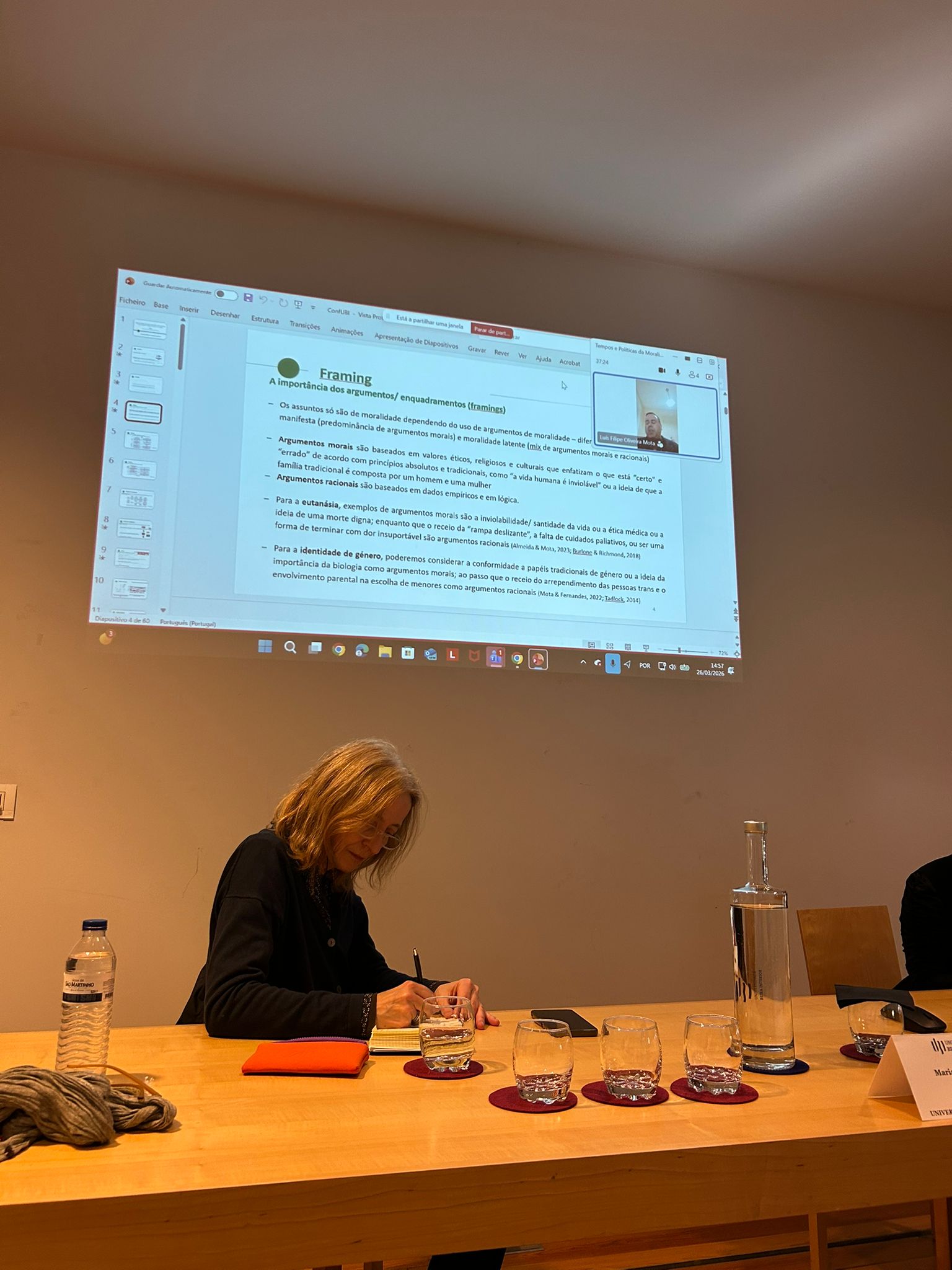 Seguiu-se a intervenção de Inês Almeida (ICS-UL) intitulado “Políticas de Moralidade em Portugal: Agendamento e Formulação dos Assuntos da Eutanásia, Gestação de Substituição, Famílias Homoafetivas e Prostituição”, focando nos resultados empíricos da sua tese de doutoramento. Começou por explicar a origem e relevância do projeto, vindo preencher uma lacuna na análise portuguesa com a análise de quatro estudos de caso (eutanásia, gestação de substituição, famílias homoafetivas e prostituição), um conjunto alargado de atores e um longo período temporal (20 anos).